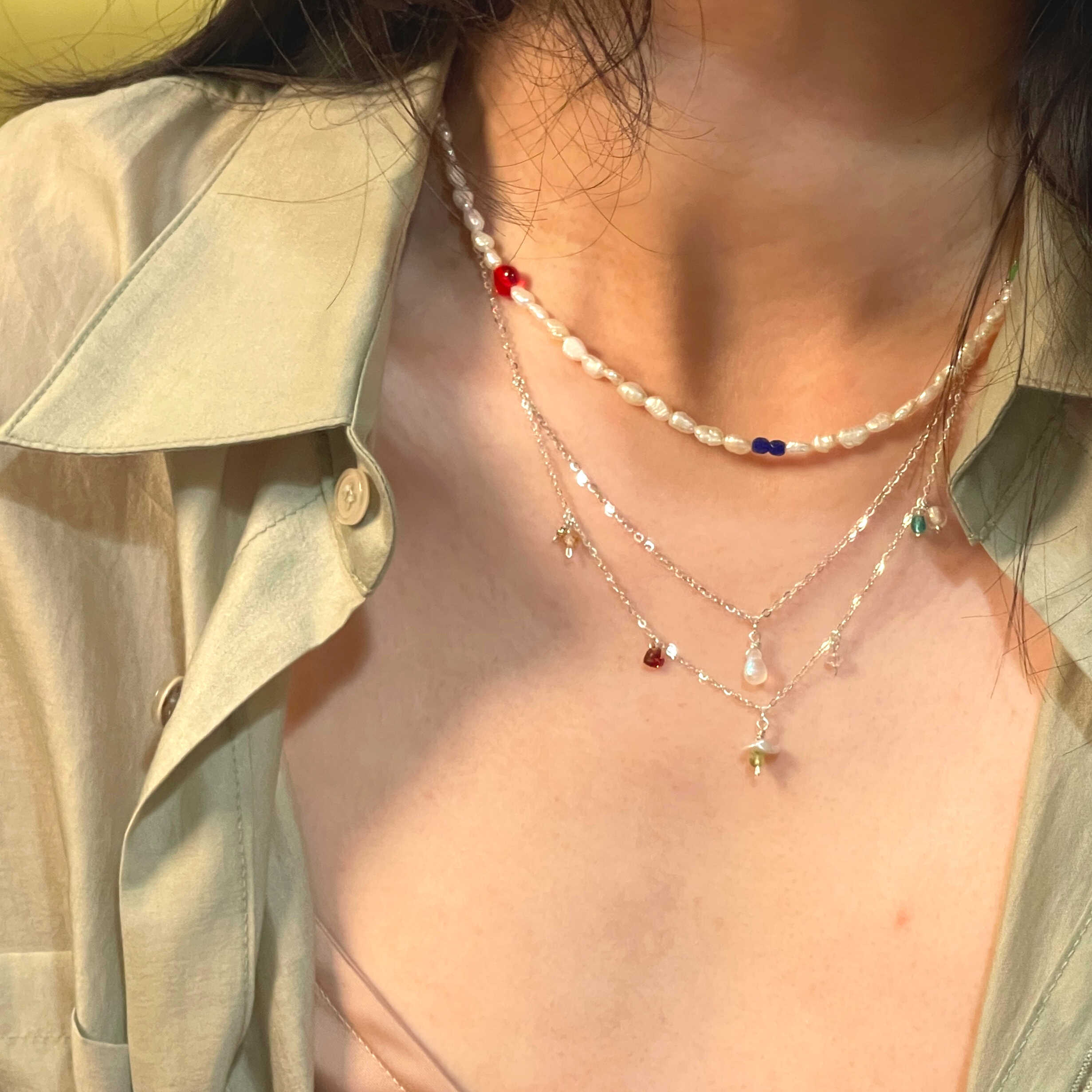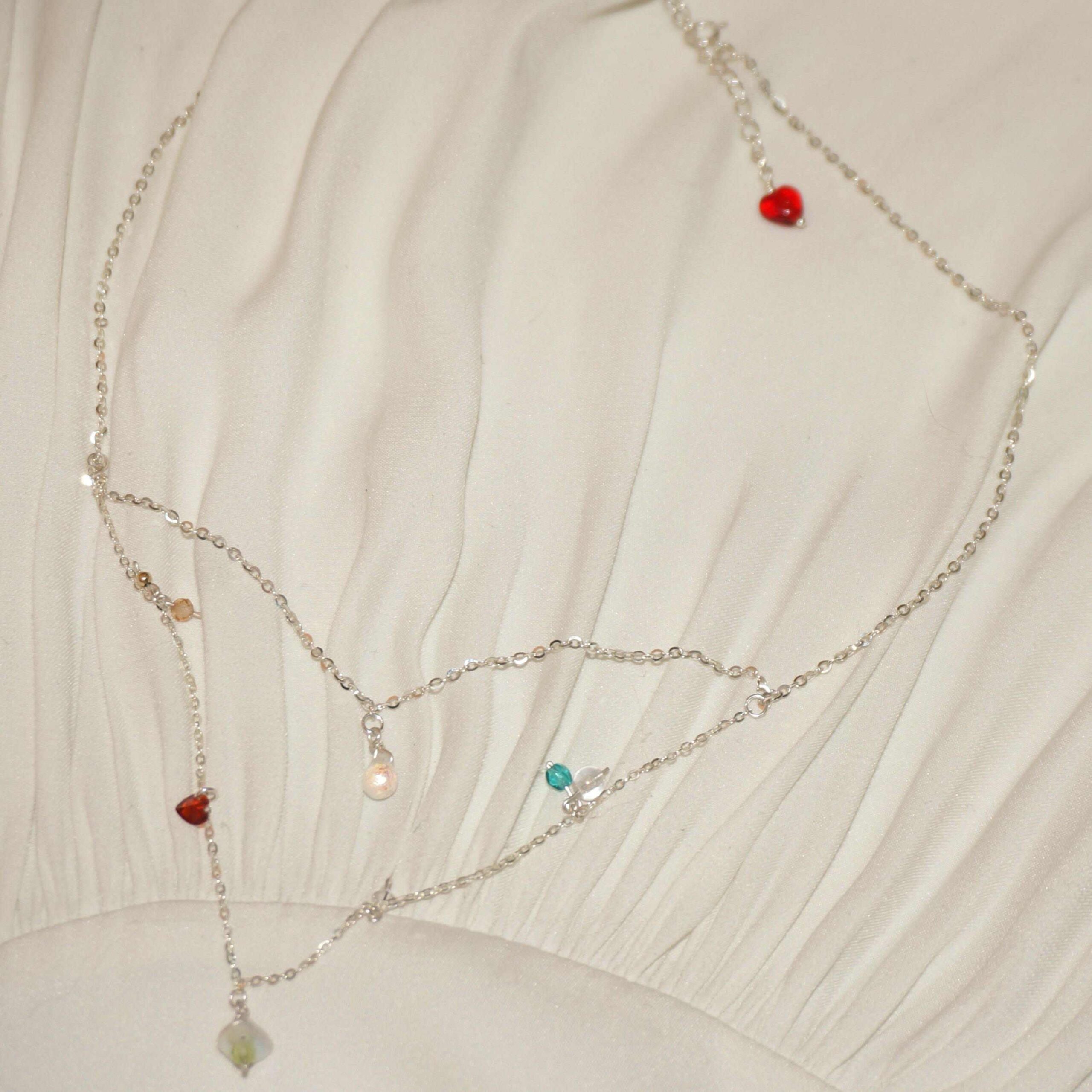 BREEZE Necklace, it can be paired with the SUMMER bracelet to create a matching set. This necklace has multiple small pendants that shimmer and sway with every movement we make, just like the feeling of a gentle breeze. The intense heat of SUMMER and the refreshing coolness of BREEZE make a perfect match, swaying gracefully. The pendant at the end is a heart-shaped bead that sways on the neck, creating a beautiful and dynamic look from behind.