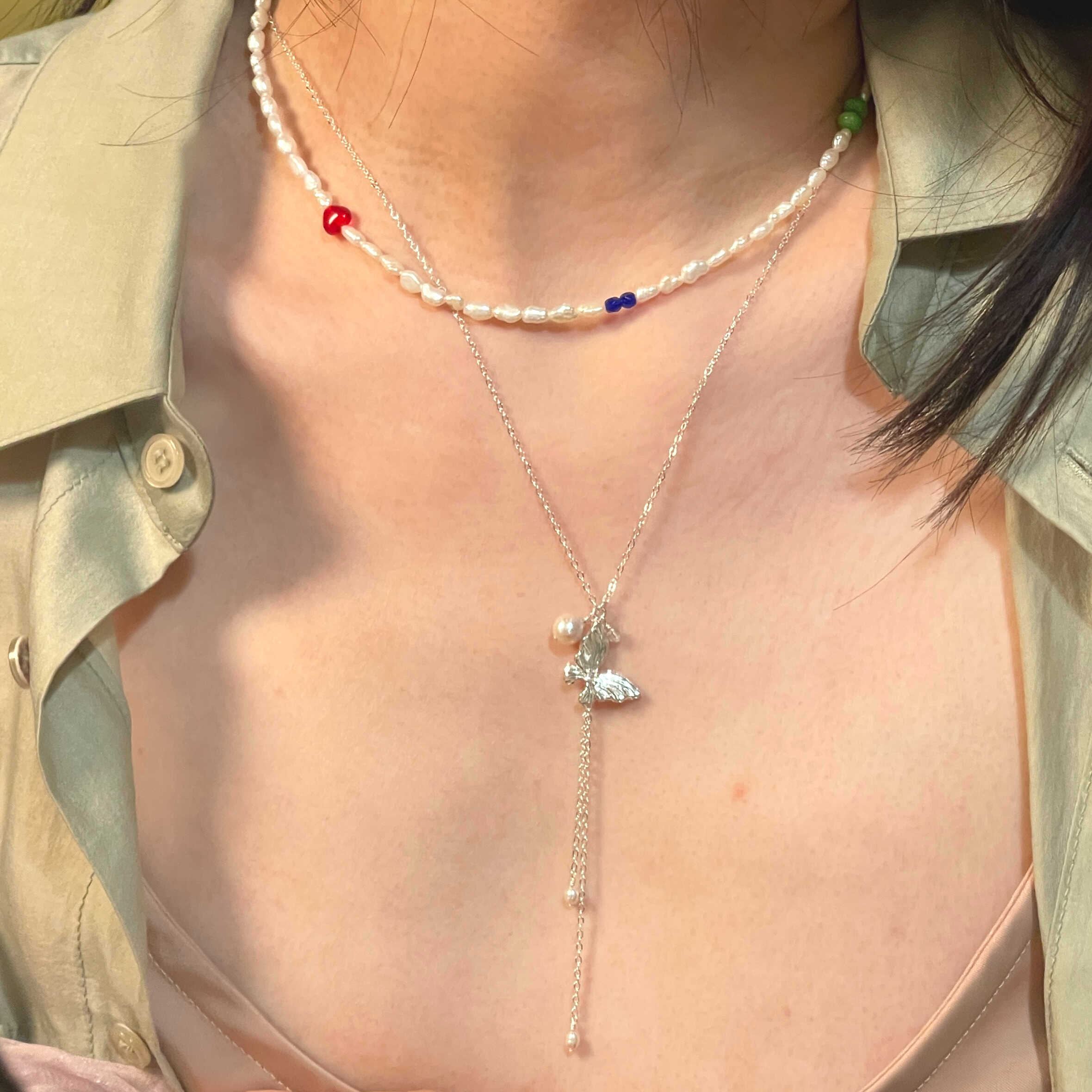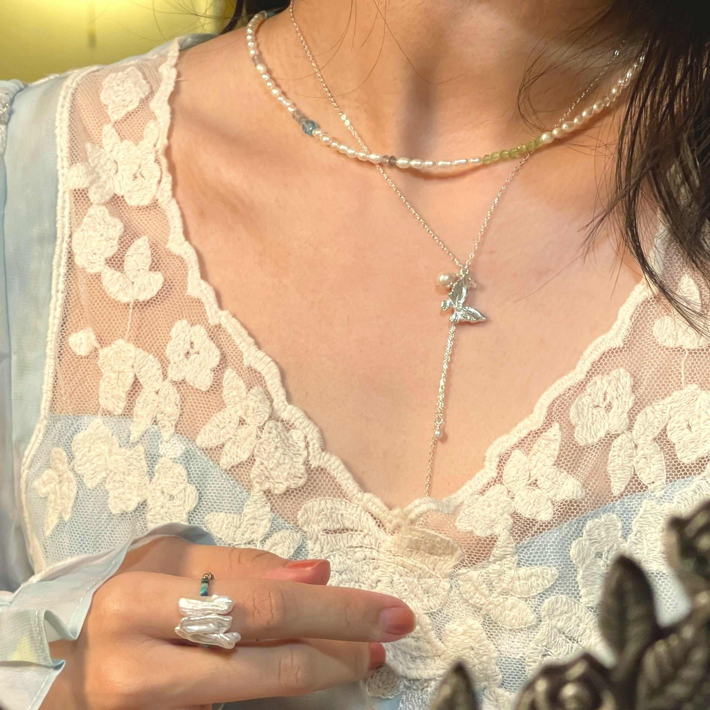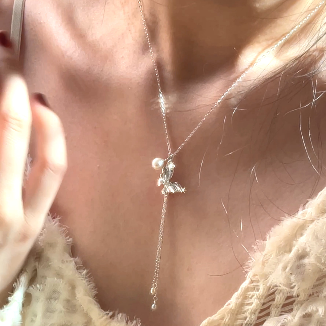This is DREAMLAND Necklace. In my opinion, dreams are romantic, with butterflies dancing gracefully, pearls glowing like moonlight, and tiny crystals sparkling like stars. The butterfly elf fulfills all of our wishes, and we dance together romanticly.