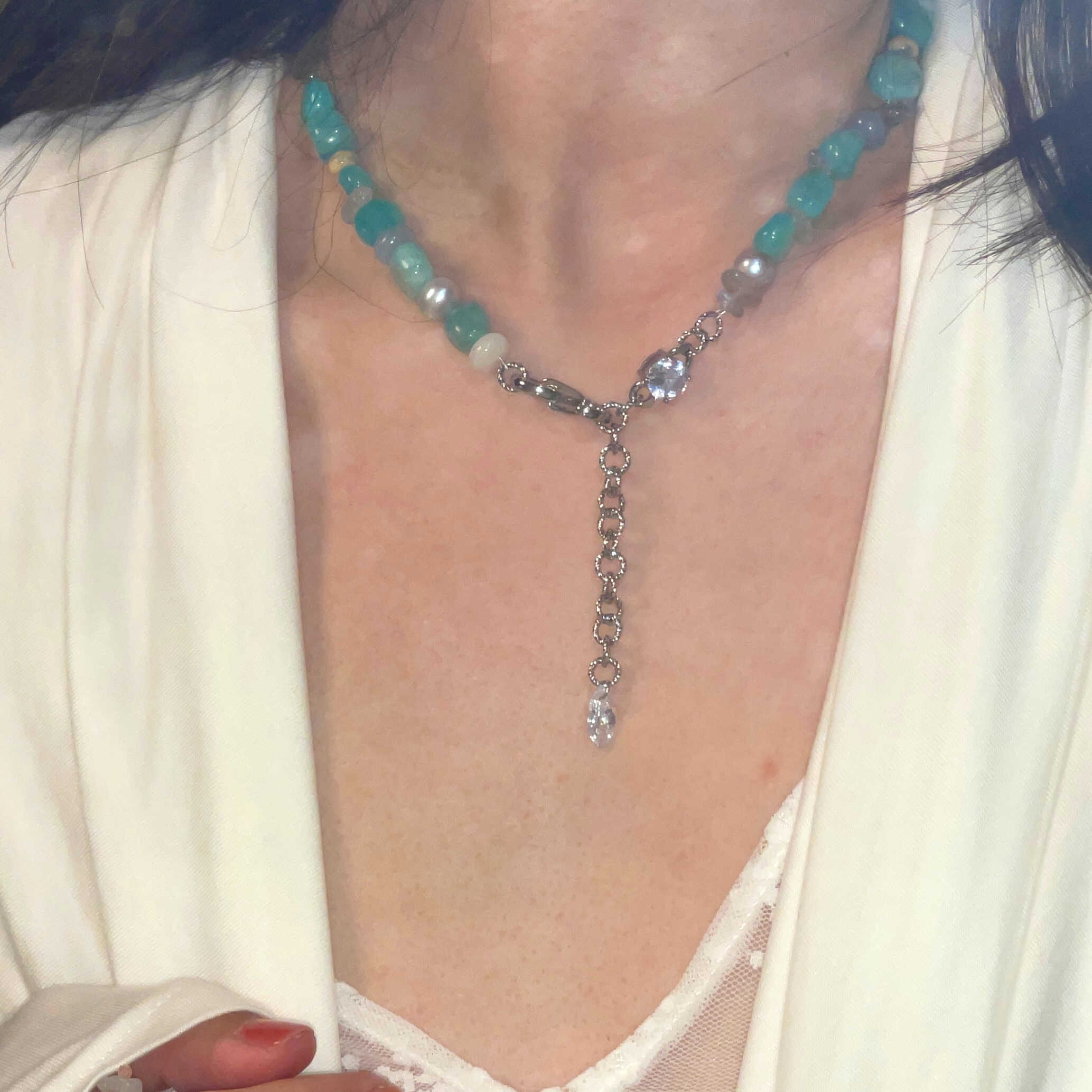 Introducing the ICEBERG Necklace, a unique and healing piece that combines the purity of Amazonite, the elegance of Baroque Pearls, and the crystalline beauty of Zircon. Designed to soothe the mind and inspire creativity, this necklace features a stunning Amazonite stone centerpiece, surrounded by lustrous Baroque Pearls and accented with shimmering Zircon at both ends, resembling the clarity and beauty of glaciers. The necklace can also be worn with the Zircon pendants at the front for a different, elegant look.