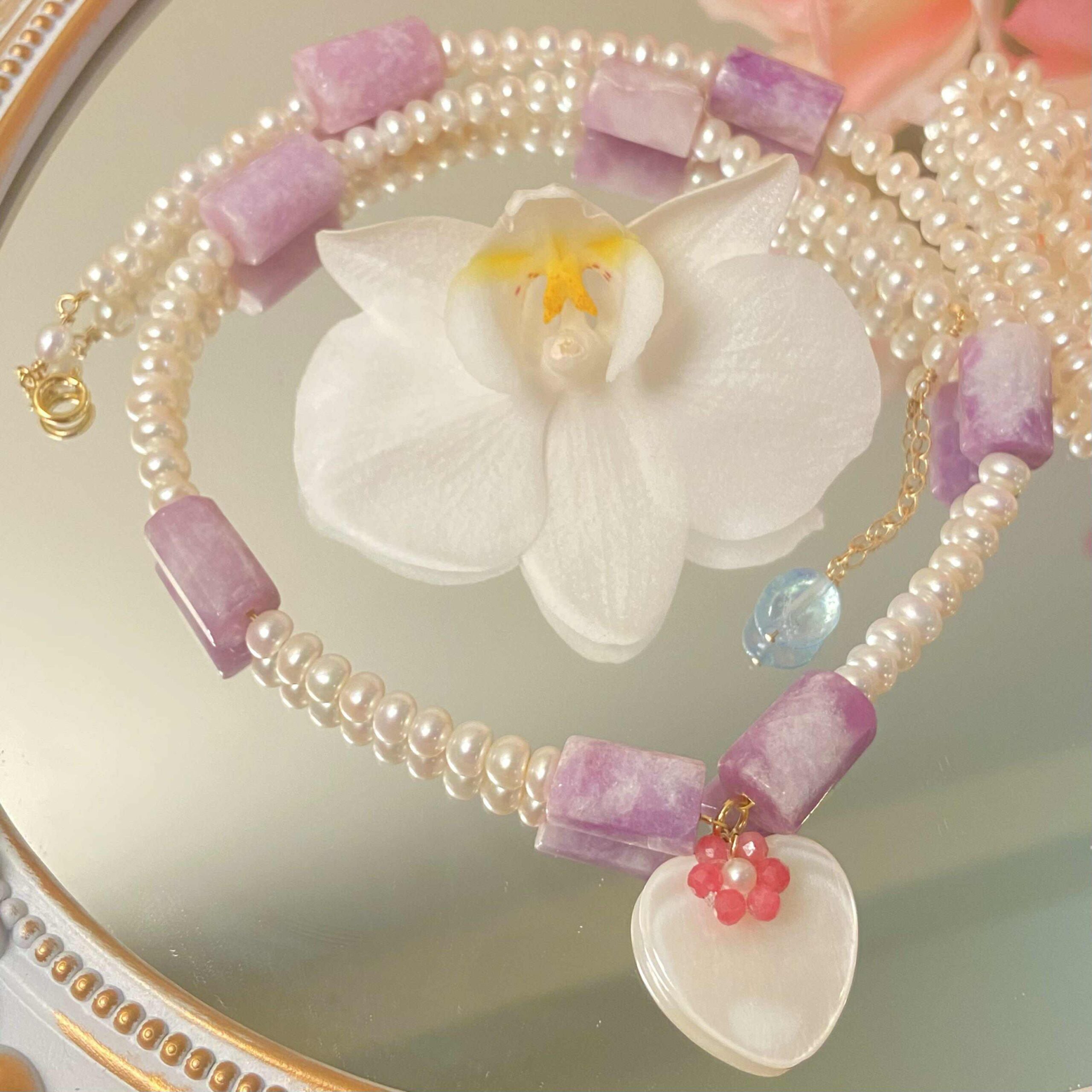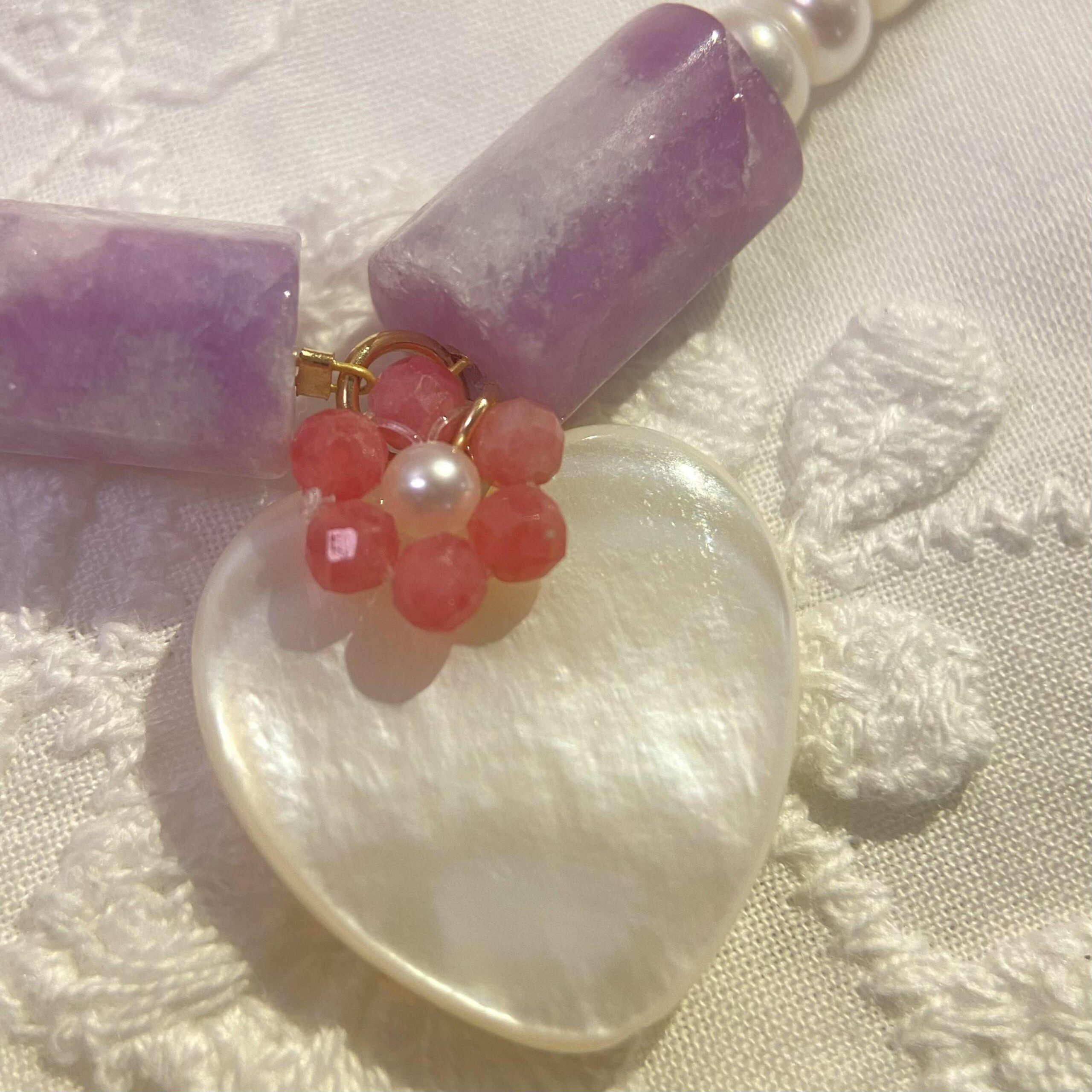 Artfully crafted, a delicate mother-of-pearl heart rests at the core, symbolizing pure love. A vivid flower made from Rhodonite and lustrous round freshwater pearl swaying around the heart-shaped mother of pearl, elegantly blooming around your neck/wrist.